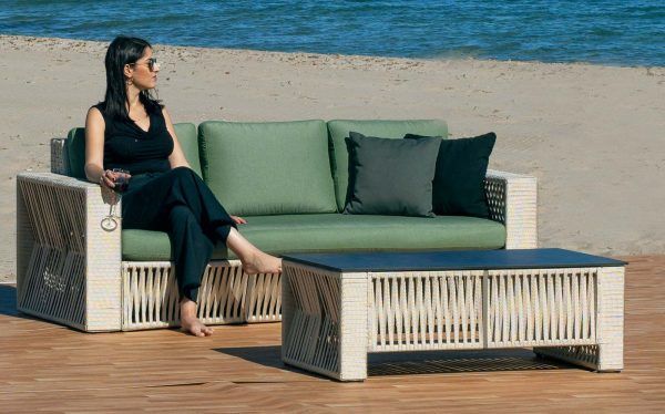 Este sofá no solo es hermoso, sino también increíblemente duradero. La estructura de aluminio garantiza una resistencia óptima a las condiciones climáticas, mientras que las cuerdas trenzadas proporcionan una textura única y una longevidad sin igual. Ideal para disfrutar durante años en tu jardín, terraza o patio.