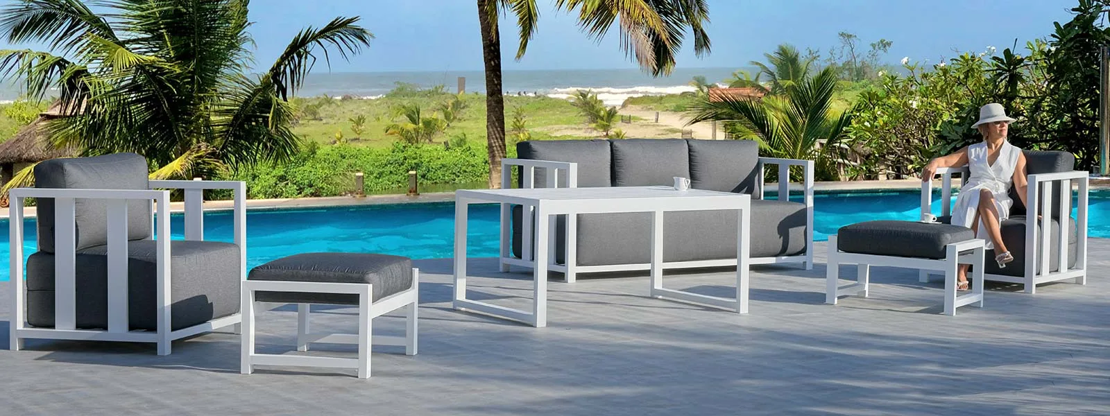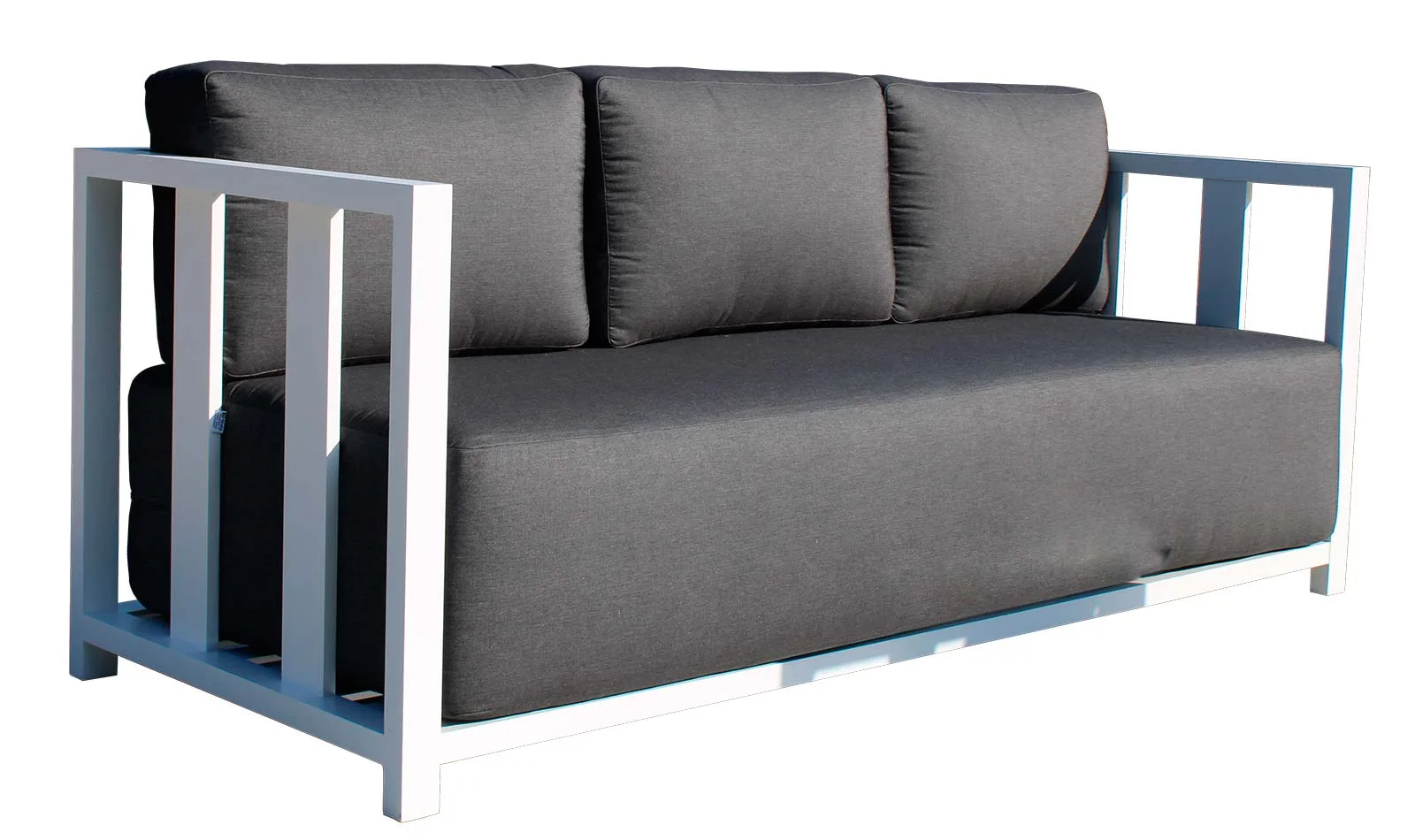 Fabricado con tejido Dralón Lux de alta gama y estructura de aluminio, este sofá garantiza una resistencia superior a los elementos. Su material de alta calidad ofrece durabilidad y resistencia a la decoloración, ideal para uso prolongado al aire libre.