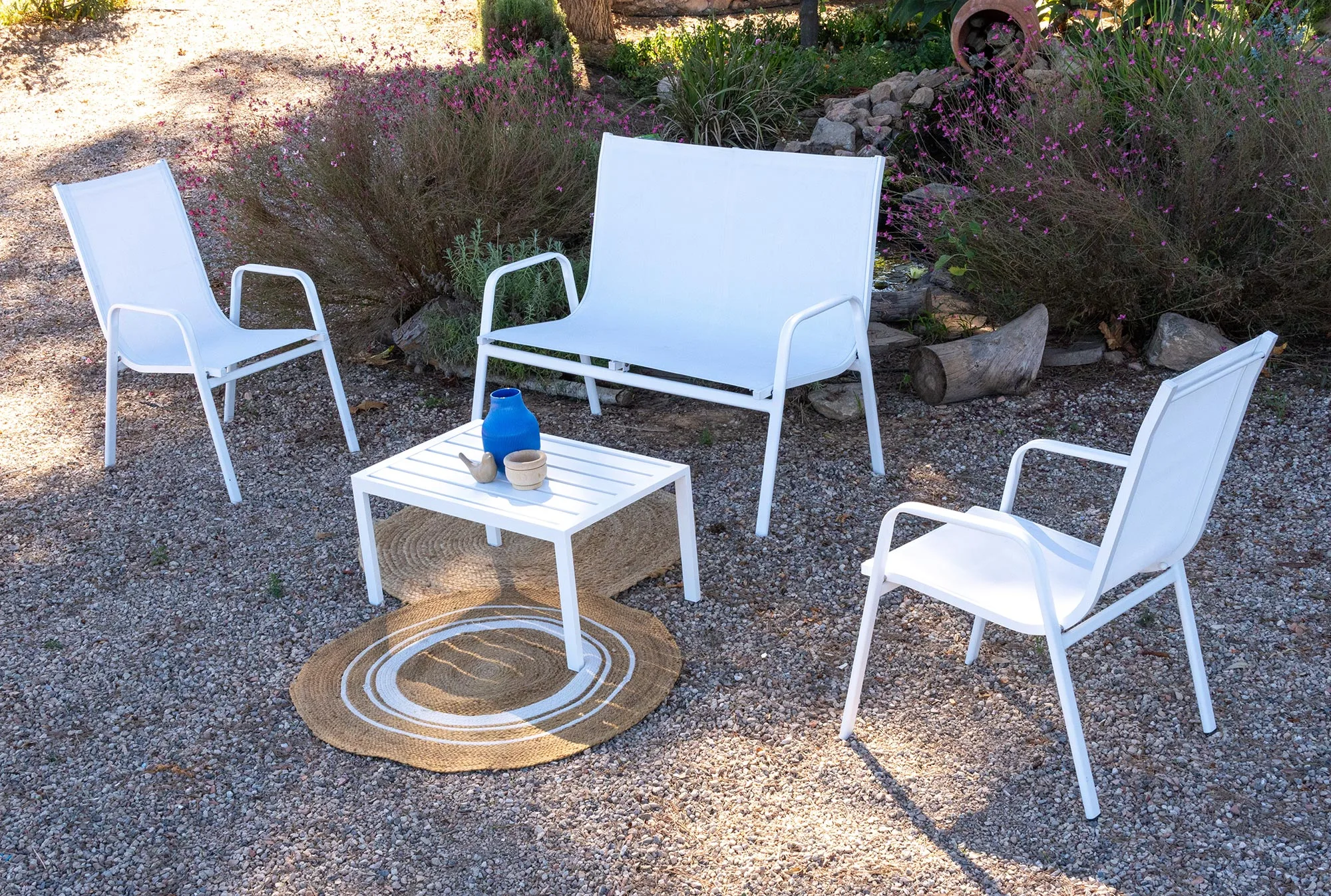 Este sofá de balcón para exterior forma parte de la colección Avalon. Aquí te dejamos enlaces. Te pude interesar hacerlo más práctico con la mesa baja de aluminio exterior. Si deseas combinarla con un juego de comedor te proponemos dos conjuntos, la mesa y sillas de exterior: modelo Avalon 150/4 y otra con la mesa más pequeña, el conjunto de comedor de jardín en aluminio: modelo Mundra 100/4.