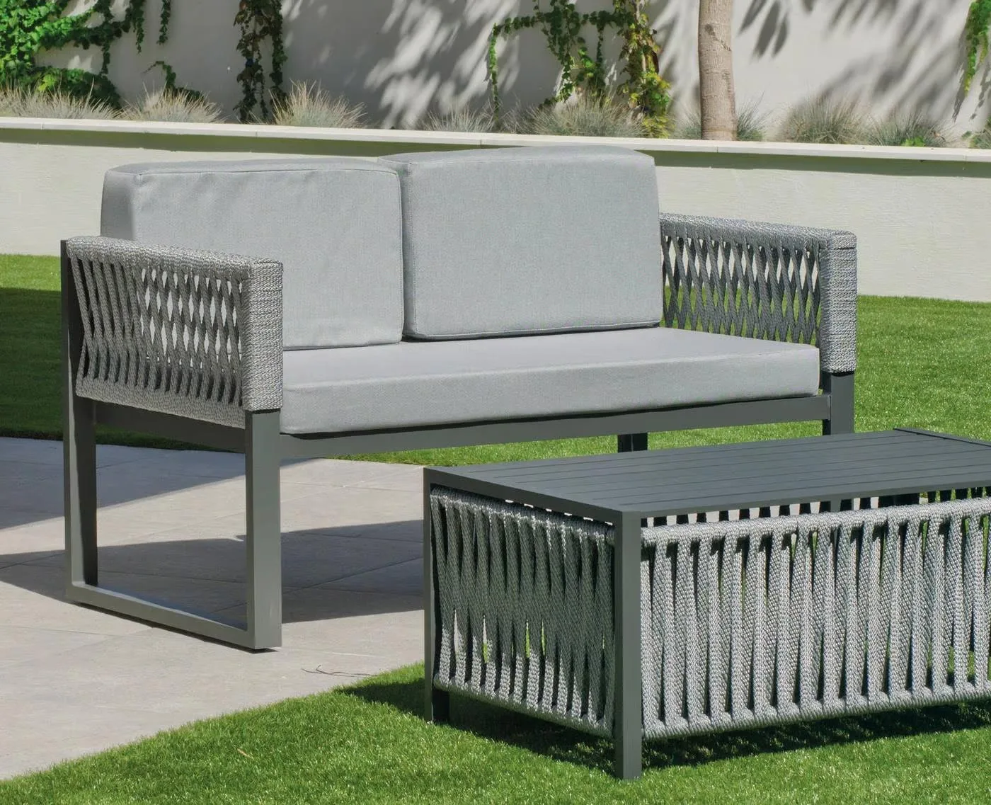 Este sofá de cuerda de 120 cm pertenece a nuestra colección de jardín, Aberdín. Forma parte de nuestro conjunto de sofá y dos sillones Aberdín 7. Combínalo con la mesa de centro y el sillón de cuerda gris, aquí te dejamos los enlaces para que puedas echarle un vistazo. ¿Buscas un sofá más grande? Échale un vistazo al sofá de cuerda 3 plazas Aberdin.