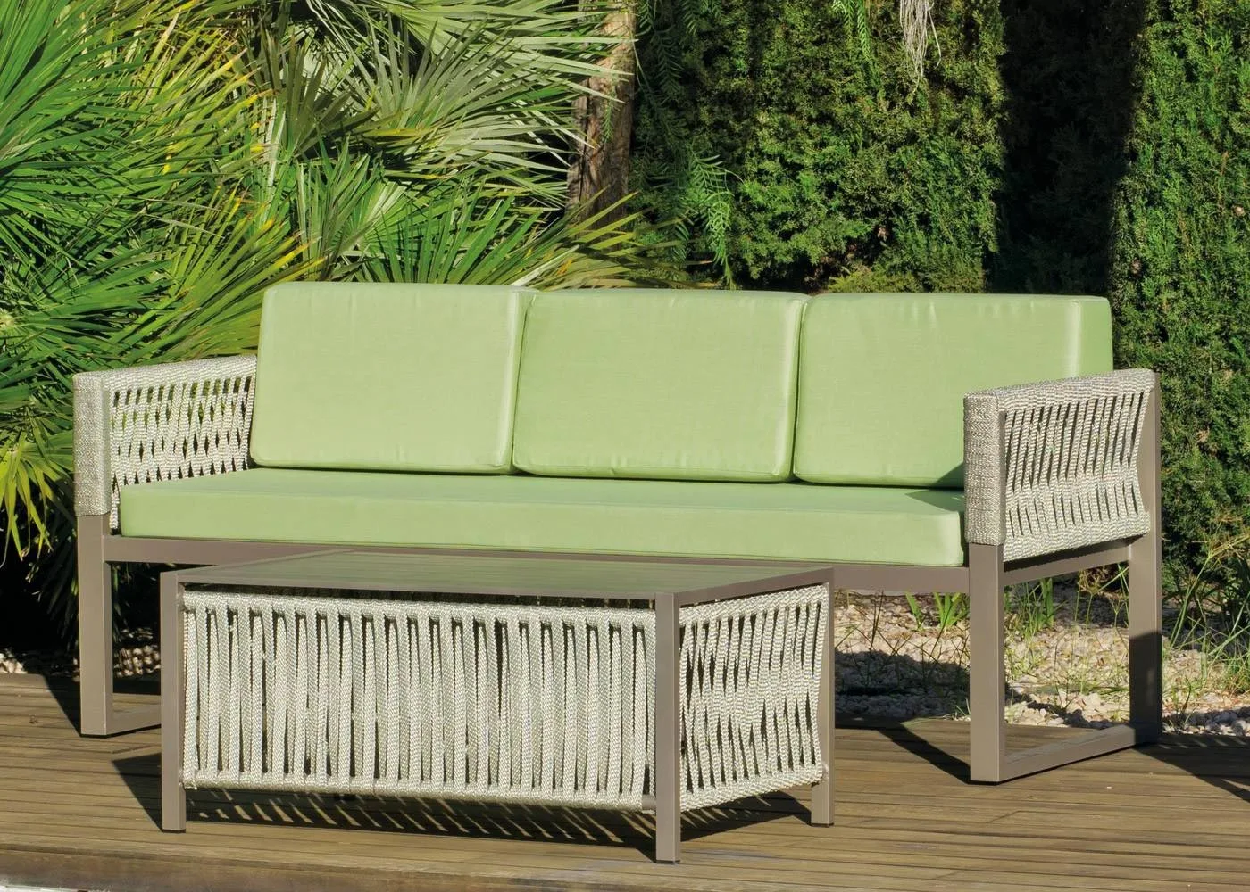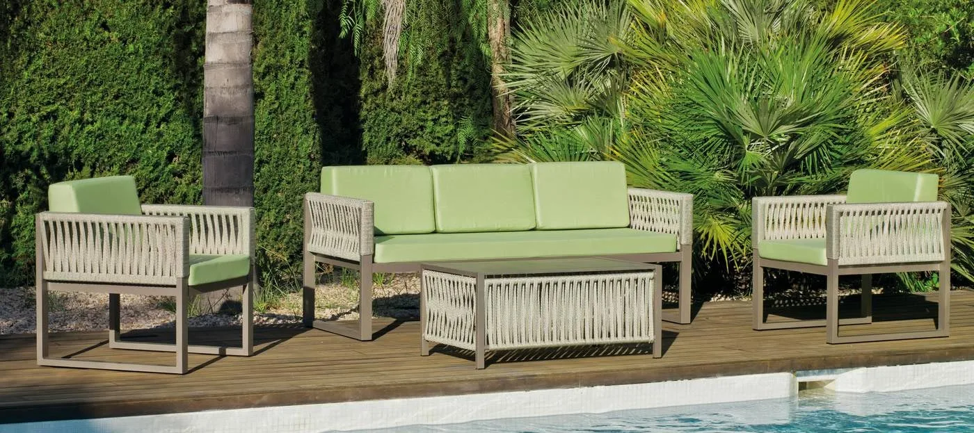 El sofá para patio de cuerda está fabricado con una estructura de aluminio. El aluminio es un material perfecto para el uso al exterior. Entre las propiedades más importantes del aluminio están: nula oxidación, resistente a la intemperie, peso ligero y fácil reparación. Una armazón de aluminio es una garantía de durabilidad.