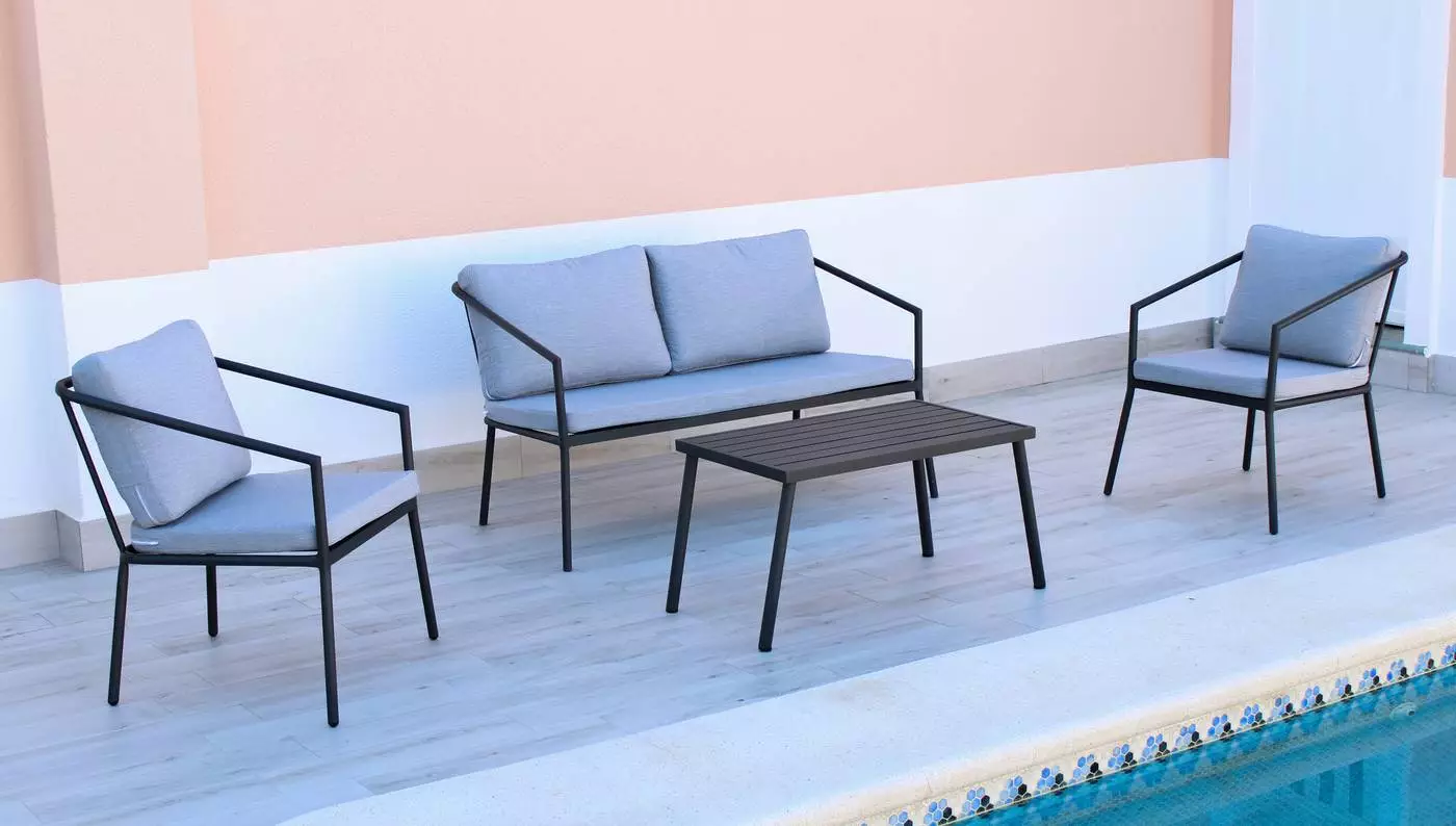 Nuestro sofá de exterior está meticulosamente fabricado con aluminio, un material que no solo resiste las inclemencias del tiempo, sino que también es ligero y fácil de manejar. La estructura del sofá está diseñada con maestría, fusionando resistencia y estilo en una sinfonía visual. Cada detalle ha sido cuidadosamente considerado, desde las líneas fluidas hasta los acabados precisos. Este sofá no solo es un mueble; es una obra de arte funcional que transformará tu espacio exterior en un santuario de elegancia.
