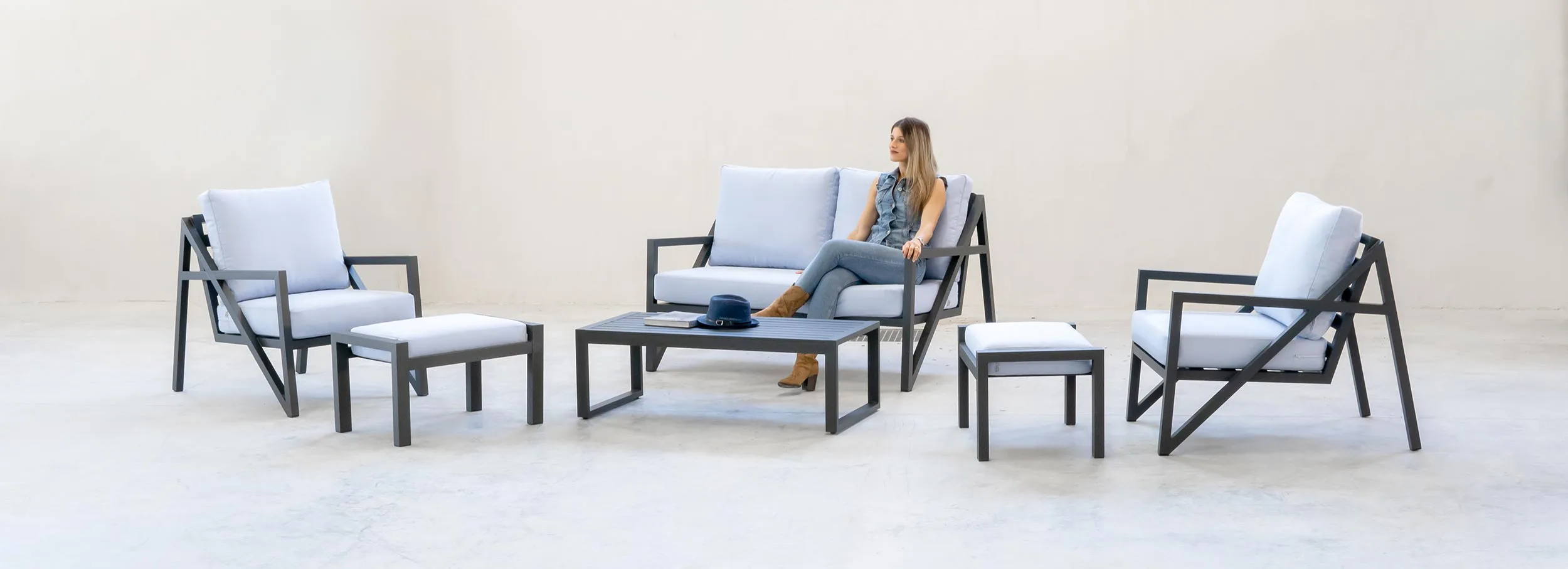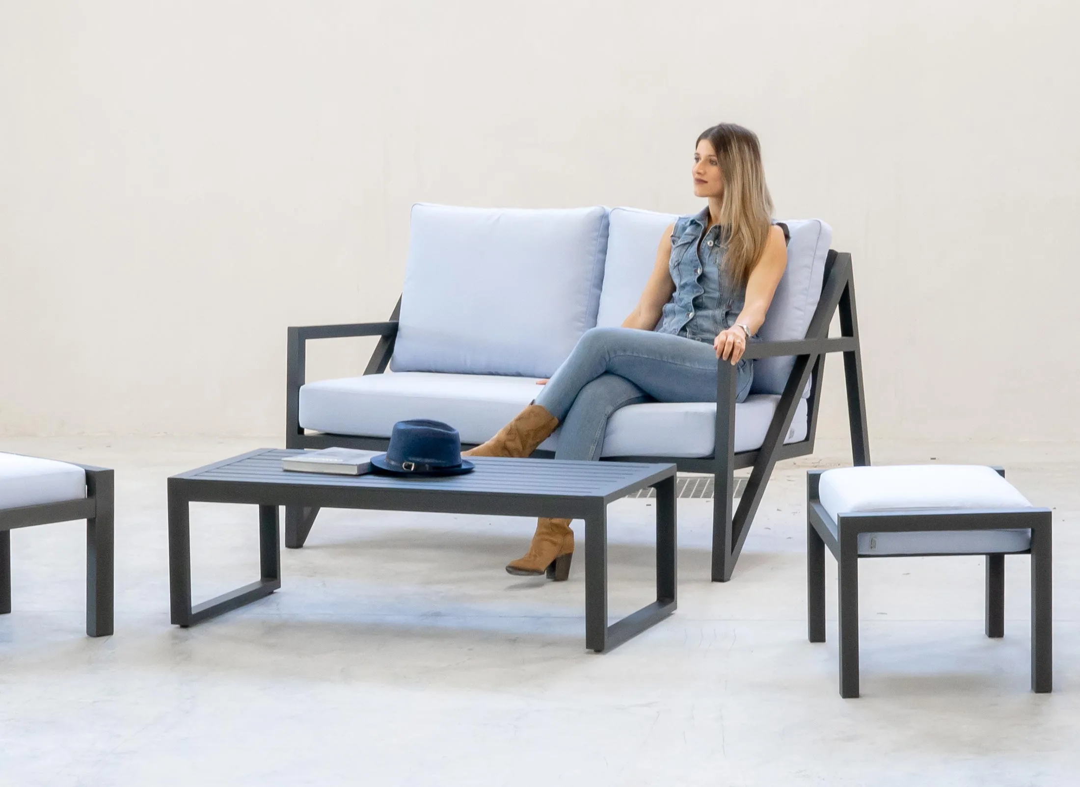 Este sofá de diseño de 2 plazas forma parte de nuestro Set de aluminio ultraligero con líneas geométricas para terrazas modernas Albania 7.