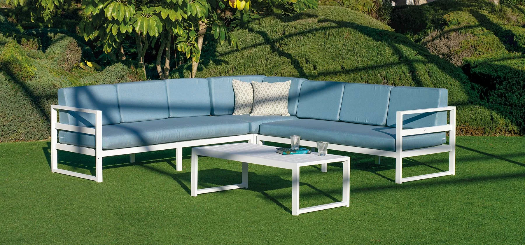Fabricado con materiales de alta calidad, este sofá de exterior esquinero está hecho para resistir. El aluminio garantiza una estructura robusta y ligera, mientras que la cojinería Dralón ofrece resistencia al agua y a los rayos UV, asegurando una larga vida útil y fácil mantenimiento, entre sus principales características destacamos:
