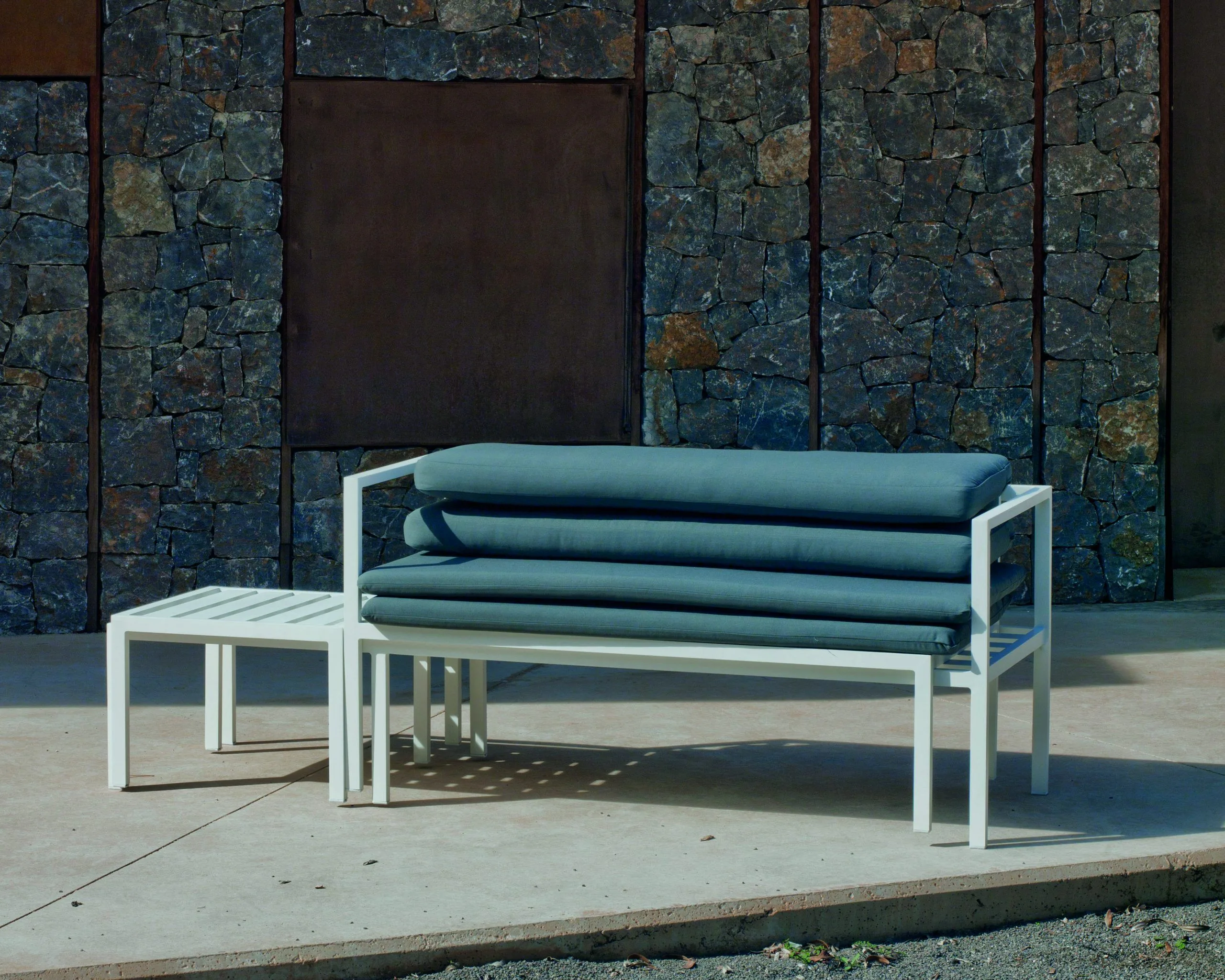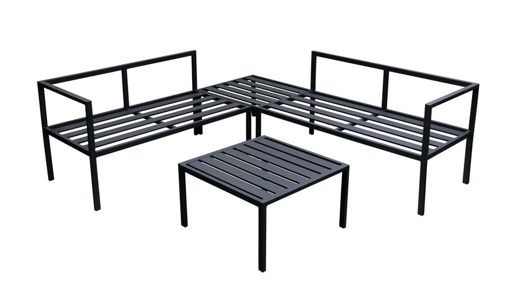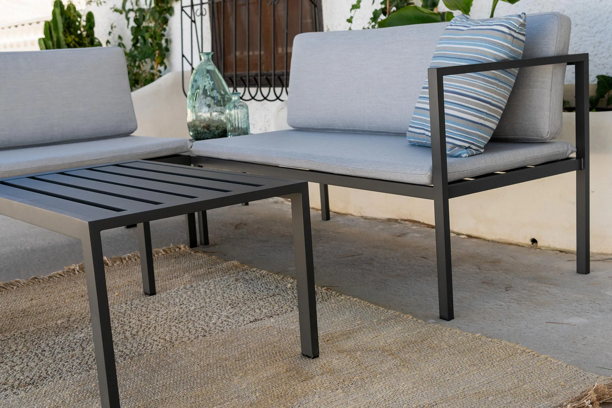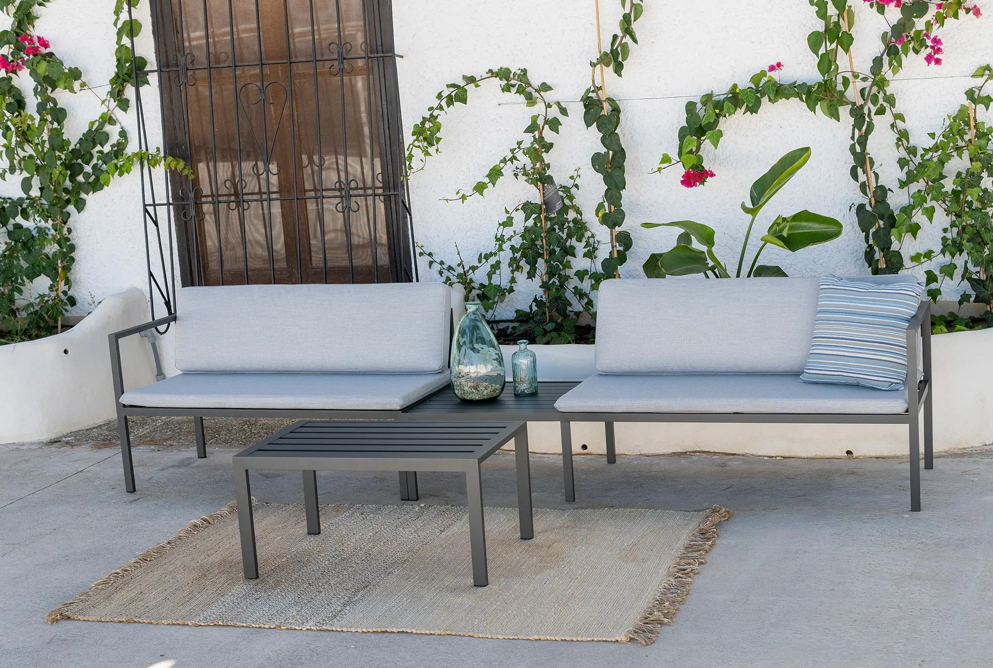 Compacto y ligero sofá esquinero de balcón, compuesto por dos sofás para rinconera de terraza pequeña y una mesa de centro de exterior de aluminio, perfecto para todo tipo de patios, balcones y terrazas. Diseñado para el confort, es una opción ideal para amueblar estancias que cuenten con espacio reducido gracias a que es apilable.