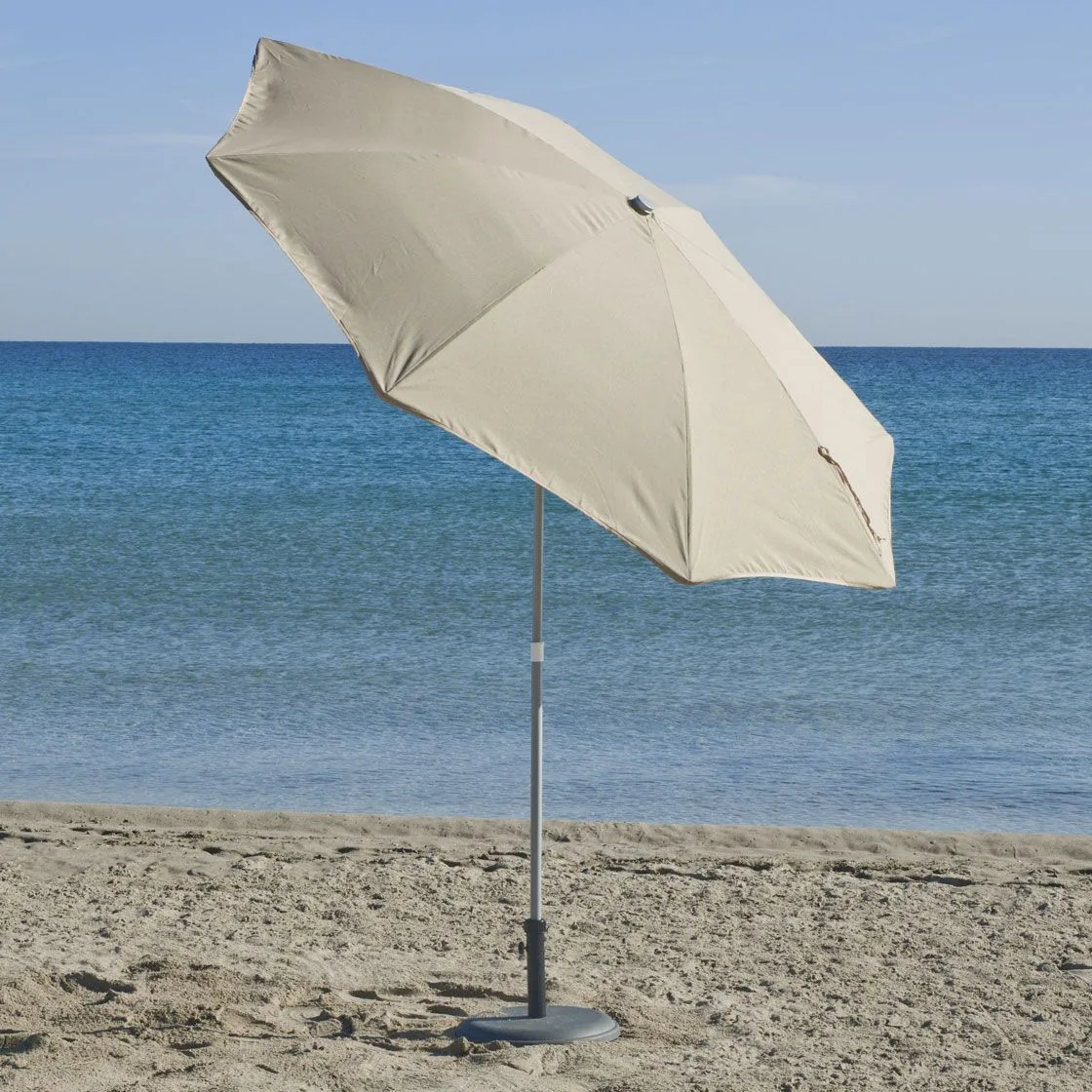 Su mástil es inclinable y está fabricado en aluminio con tubo de Ø 32, lo que aumenta su resistencia y disminuye su peso. Su toldo de lona con 8 varillas de doble refuerzo te proporcionará protección contra los rayos UVA con un tamaño de Ø 240 cm. te dará la máxima seguridad contra el viento.