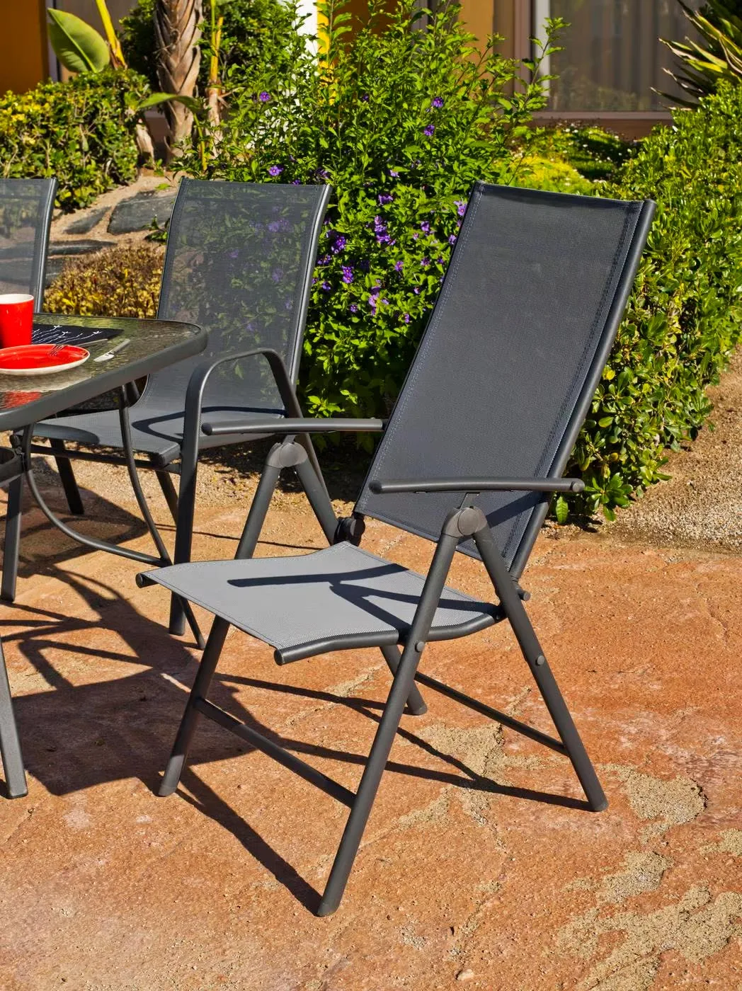 Su estructura de acero lacado en gris antracita es resistente a la intemperie, asiento y respaldo en tejido textilene, esta silla es perfecta para relajarse y disfrutar del sol en un día hermoso. ¡Imagínate sentado en ella con tu bebida favorita y disfrutando de la vista de tu jardín!